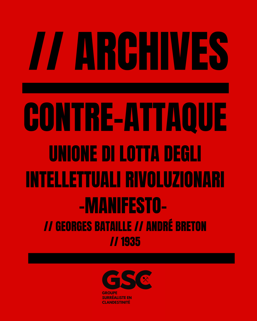Il testo che segue rappresenta il manifesto politico dell’Unione di Lotta degli Intellettuali Rivoluzionari, gruppo nato nel 1935 all’interno del movimento Contre-Attaque, promosso da Georges Bataille, André Breton e altri esponenti dell’avanguardia parigina.