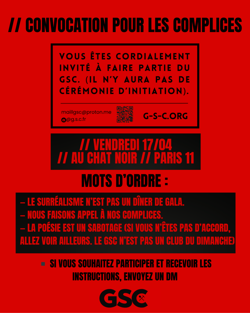 VOUS ÊTES CORDIALEMENT INVITÉS À REJOINDRE LE GROUPE SURRÉALISTE EN CLANDESTINITÉ. (IL N’Y AURA PAS DE CÉRÉMONIE D’INITIATION).